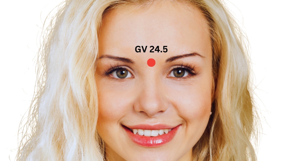 The first point we’ll explore is Governing Vessel 24.5, also known as the Hall of Impression. Sounds fancy, right? But don’t worry, it’s super easy to find. This point is located right between the ends of your eyebrows, in the middle of your forehead.